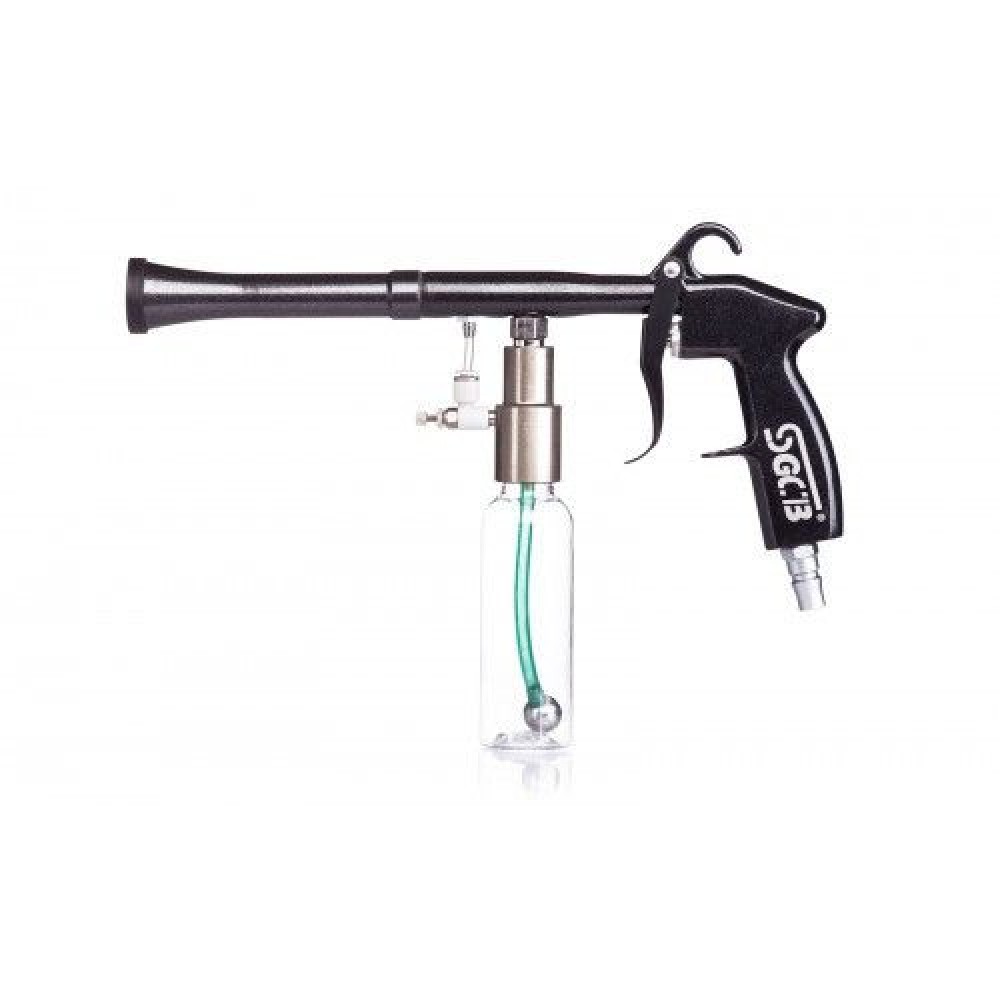 Пистолет работает по принципу эффекта торнадо и создает мощный вихревой поток, под действием подается состав из бачка и на выходе превращается в направленный мелкодисперсный туман.